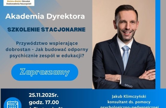 Szanowni Państwo,Zapraszamy na inspirujące i praktyczne szkolenie pt. "Przywództwo wspierające dobrostan - Jak budować odporny psychicznie zespół w ed...