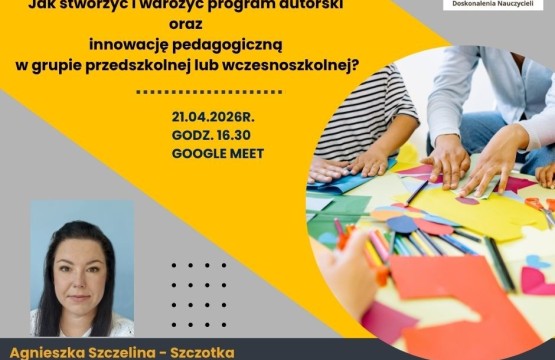 Zapraszamy na praktyczne spotkanie metodyczne online poświęcone tworzeniu i wdrażaniu programów autorskich oraz innowacji pedagogicznych w edukacji pr...