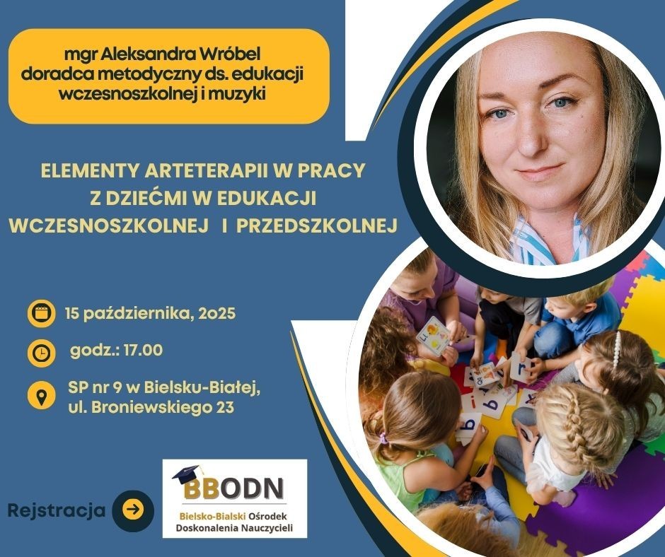 serdecznie zapraszamy nauczycieli wychowania przedszkolnego i edukacji wczesnoszkolnej na warsztaty stacjonarne: "Elementy arteterapii w pracy z dziećmi w edukacji wczesnoszkolnej i w przedszkolu", które odbędą się 15 października 2025r.(środa) o godz.17.00. Szkolenie poprowadzi nasza doradczyni metodyczna ds.edukacji wczesnoszkolnej i muzyki mgr Aleksandra Wróbel.