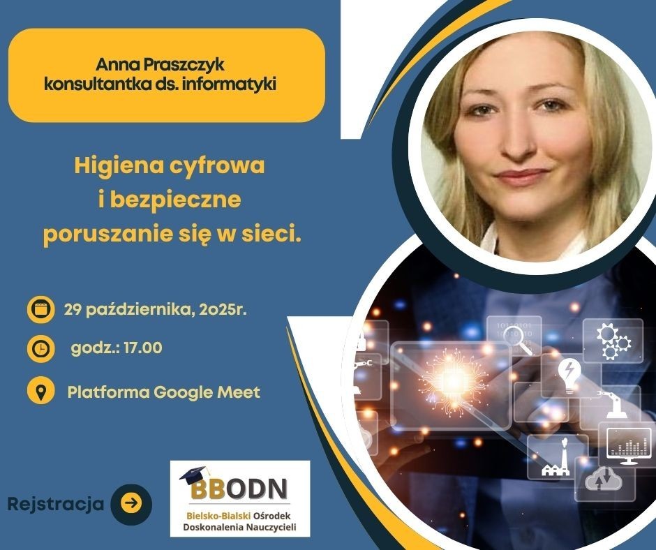 serdecznie zapraszamy nauczycieli zainteresowanych tematem "Higienacyfrowa i bezpieczne poruszanie się w sieci", które odbędzie się 29.10.2025r. (środa) o godz. 17.00 na platformie Google Meet.