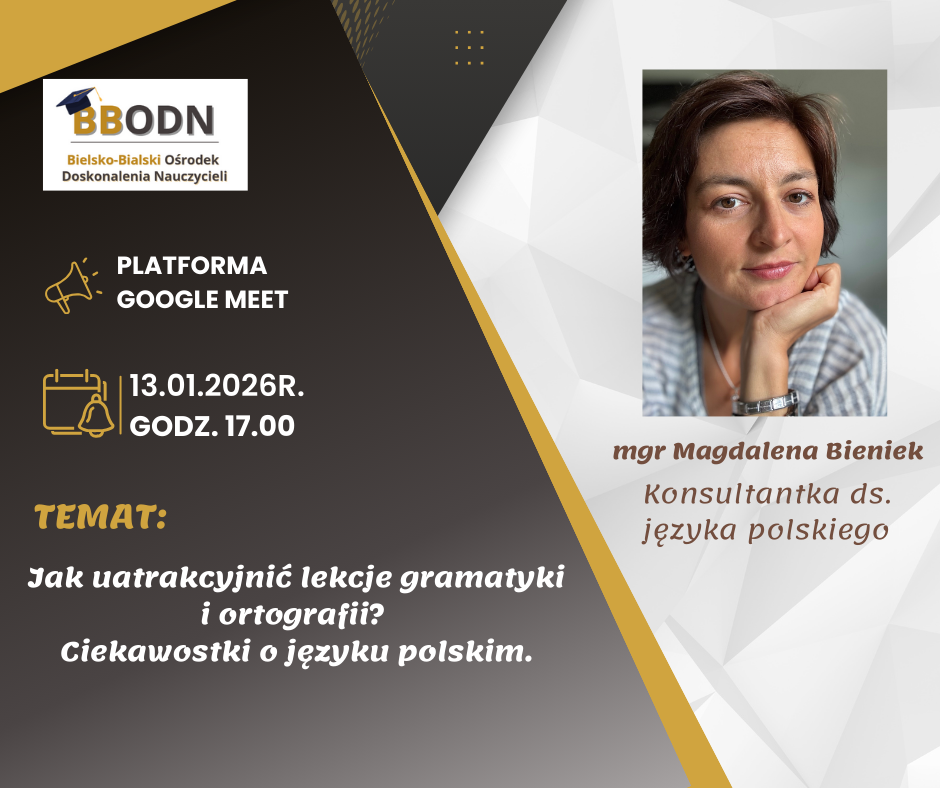 Zapraszamy nauczycieli języka polskiego szkół podstawowych i ponadpodstawowych na inspirujące szkolenie poświęcone temu, jak ożywić lekcje gramatyki i ortografii oraz wykorzystać językowe ciekawostki, etymologie, zgadki i gry słowne, by angażować uczniów i wspierać ich w przygotowaniach do egzaminu. Spotkanie odbędzie 13 stycznia 2026r. o godz. 17.00 na platformie Google Meet a poprowadzi je mgr Magdalena Bieniek - nauczycielka kosultantka ds. nauczania języka polskiego.