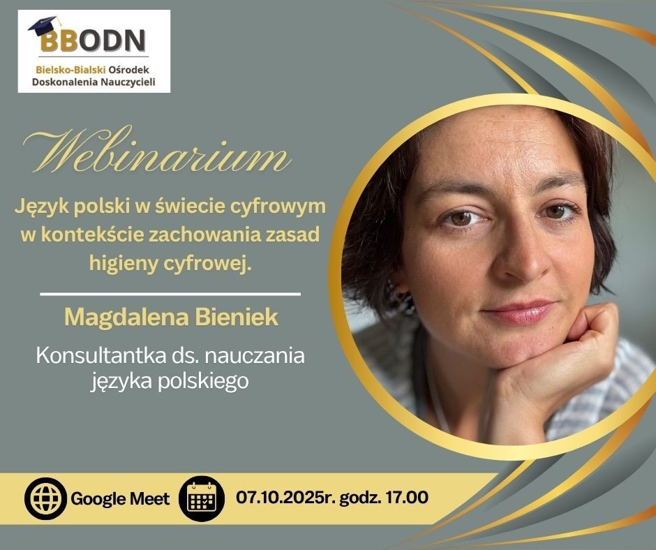 serdecznie zapraszamy nauczycieli języka polskiego na webinarium: "Język polski w świecie cyfrowym w kontekście zachowania zasad higieny cyfrowej", które odbędzie się 7 października 2025r., o godz.17.00 na platformie Google Meet. Poprowadzi je nasza konsultantka ds. nauczania języka polskiego mgr Magdalena Bieniek.