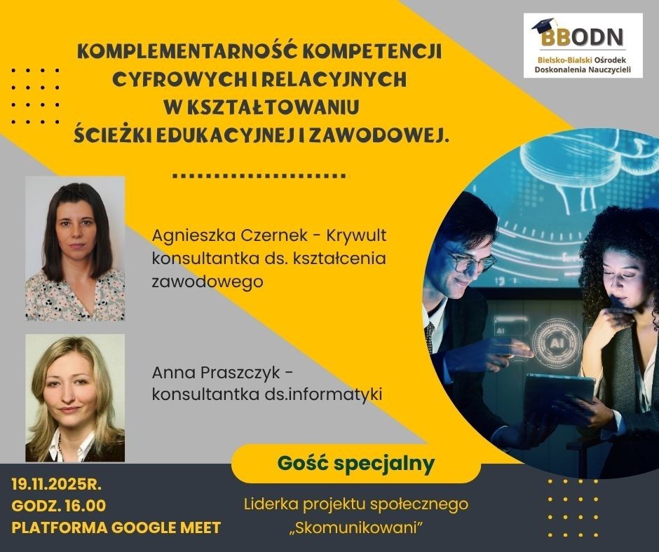 serdecznie zapraszamy nauczycieli zainteresowanych tematem: „KOMPLEMENTARNOŚĆ KOMPETENCJI CYFROWYCH I RELACYJNYCH W KSZTAŁTOWANIU ŚCIEŻKI EDUKACYJNEJ I ZAWODOWEJ” na webinarium, które odbędzie 19.11.2025r.(środa) o godz.16.00 na Platformie Google Meet. Szkolenie poprowadzą: mgr Agnieszka Czernek-Krywult-konsultantka BBODN