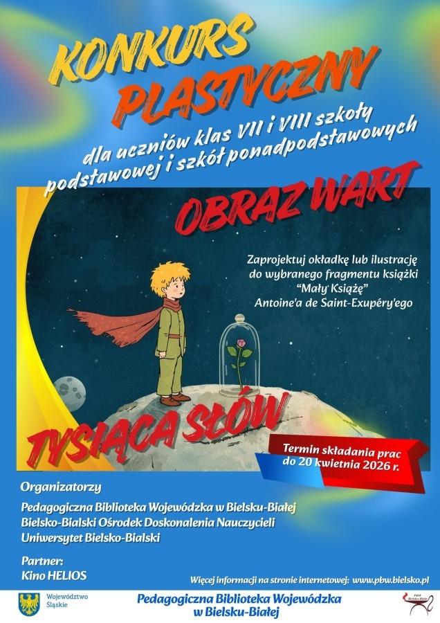 Pedagogiczna Biblioteka Wojewódzka w Bielsku-Białej zaprasza uczniów klas 7–8 szkół podstawowych oraz szkół ponadpodstawowych do udziału w konkursie plastycznym na autorską okładkę lub ilustrację do Małego Księcia Antoine’a de Saint‑Exupéry’ego. Liczymy na świeże spojrzenie, własną interpretację i odważną, intrygującą formę.