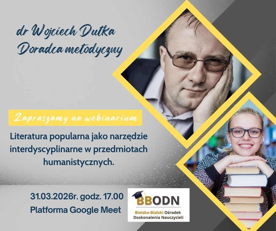 Serdecznie zapraszamy nauczycieli szkół podstawowych i ponadpodstawowych na webinar pt. „Literatura popularna jako narzędzie interdyscyplinarne w przedmiotach humanistycznych”.