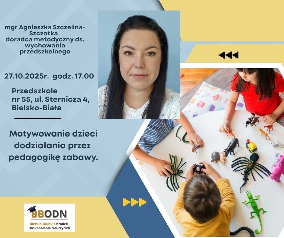 serdecznie zapraszamy nauczycieli wychowania przedszkolnego na warsztaty stacjonarne nt."Motywowanie dzieci do działania przez pedagogikę zabawy". Warsztaty odbędą się w Przedszkolu nr 55, ul. Sternicza 4, Bielsko -Biała (wejście i parking od ulicy Goleszowskiej, prosimy wjechać na przedszkolny parking lub stanąć na miejscach dla pracowników), w dniu 27 października 2025r.(poniedziałek) o godz. 17.00. Szkolenie poprowadzi nasza doradczyni metodyczna ds.wychowania przedszkolnego mgr Agnieszka Szczelina-Szczotka.