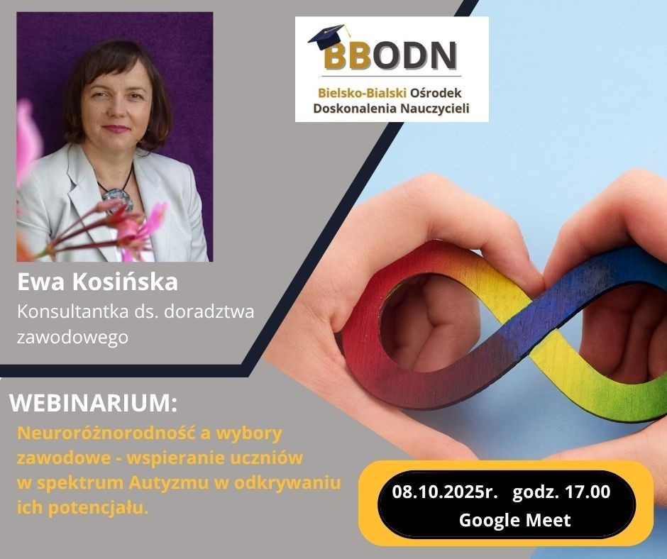 serdecznie zapraszamy nauczycieli współorganizujących proces kształcenia, doradców zawodowych, pedagogów, wychowawców na webinarium:"Neuroróżnorodność a wybory zawodowe - wspieranie uczniów w spektrum Autyzmu w odkrywaniu ich potencjału", które odbędzie się 8 października 2025r.(środa), o godz.17:00, na platformie Google Meet.
