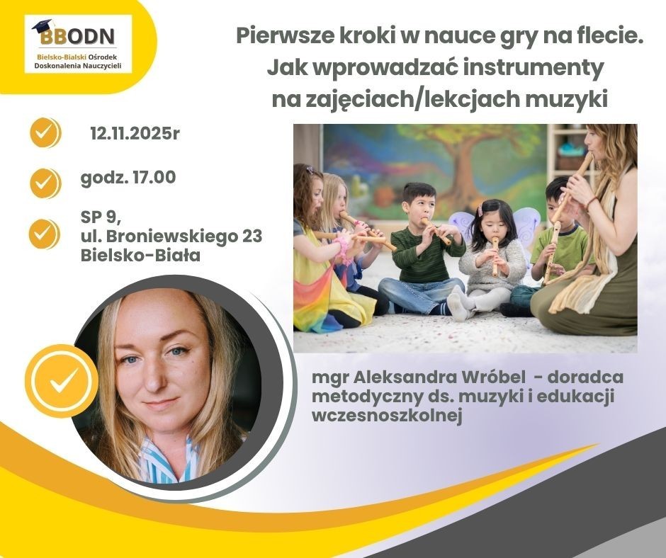 serdecznie zapraszamy nauczycieli edukacji wczesnoszkolnej i nauczycieli muzyki na warsztaty stacjonarne "Pierwsze kroki w nauce gry na flecie. Jak wprowadzać instrumenty na zajęciach/lekcjach muzyki", które odbędą się 12 listopada 2025r. (środa) o godz.17.00 w SP9 w Bielsku-Białej, ul.Broniewskiego 23. Szkolenie poprowadzi mgr Aleksandra
