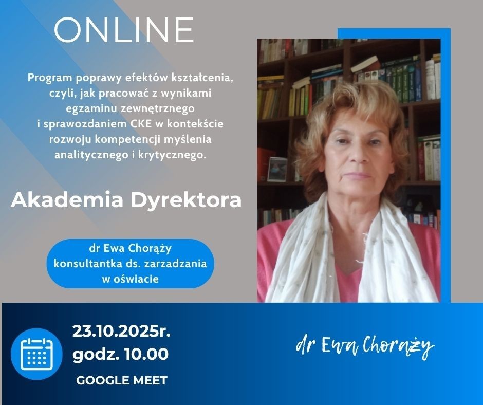 Spotkanie odbędzie się 23.10.2025r. o godz. 10.00 na platformie Google Meet a prowadzącą będzie dr Ewa Chorąży konsultantka ds. zarządzania w oświacie.