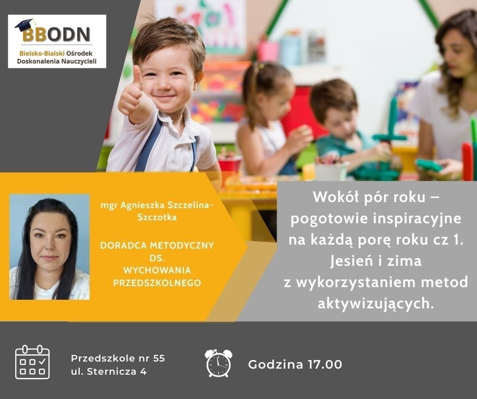 serdecznie zapraszamy nauczycieli wychowania przedszkolnego na warsztaty stacjonarne: "Wokół pór roku – pogotowie inspiracyjne na każdą porę roku cz 1. Jesień i zima z wykorzystaniem metod aktywizujących", które odbędą się 29.09.2025r. (poniedziałek) o godz.17.00. Poprowadzi je nasz nauczyciel-doradca metodyczny ds.wychowania przedszkolnego mgr Agnieszka Szczelina-Szczotka.