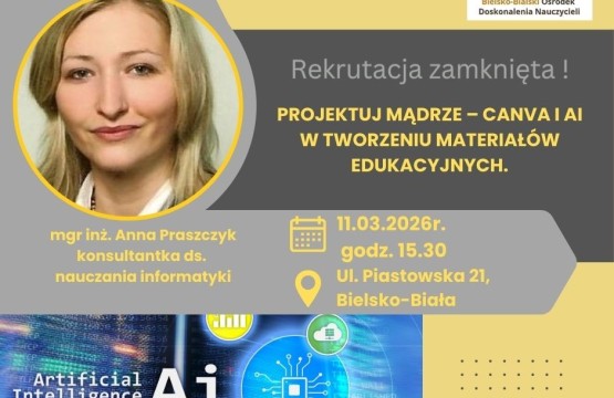 Informujemy, że zapisy na szkolenie „Projektuj mądrze – Canva i AI w tworzeniu materiałów edukacyjnych” zostały zakończone.