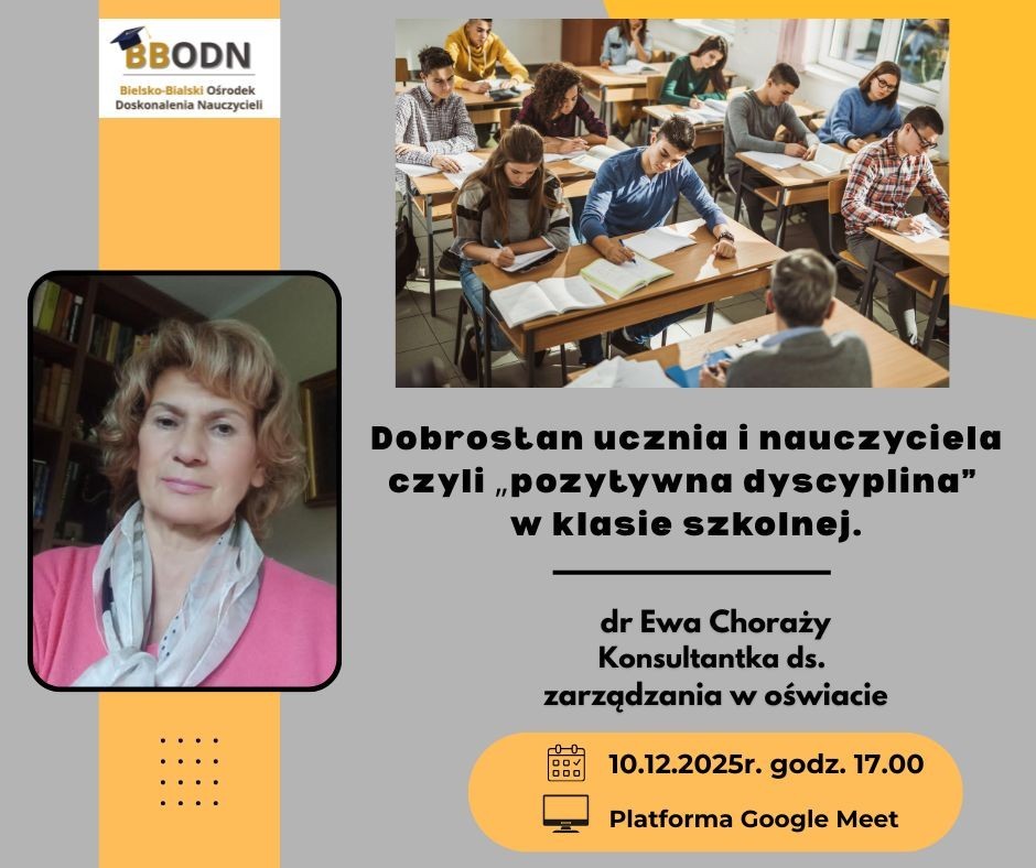 serdecznie zapraszamy wszystkich nauczycieli szkół podstawowych i ponadpodstawowych na szkolenie pt. Dobrostan ucznia i nauczyciela, czyli, „pozytywna dyscyplina” w klasie szkolnej, które zostanie poprowadzone przez dr Ewę Chorąży i odbędzie się 10 grudnia 2025r. o godzinie 17:00 na platformie Google Meet .