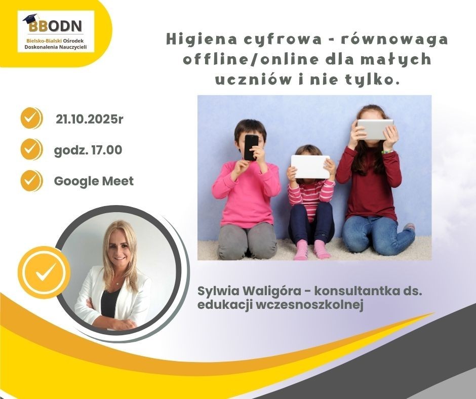 serdecznie zapraszamy nauczycieli edukacji wczesnoszkolnej na webinarium nt."Higiena cyfrowa - równowaga offline/online dla małych uczniów i nie tylko", które odbędzie się 21.10. 2025r. (wtorek), o godz. 17.00, na platformie Google Meet. Szkolenie poprowadzi nasza konsultantka ds. edukacji wczesnoszkolnej mgr Sylwia Waligóra.