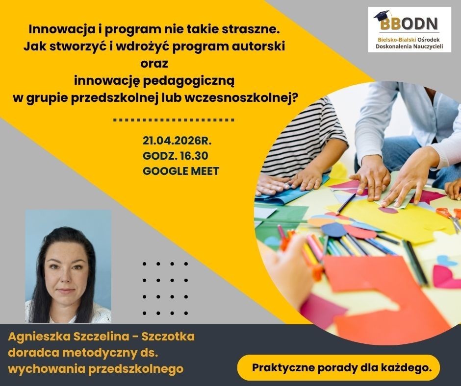 Spotkanie poprowadzi Agnieszka Szczelina‑Szczotka, doradca metodyczny ds. wychowania przedszkolnego, która w przystępny i praktyczny sposób pokaże, że innowacja i program własny mogą być narzędziami wspierającymi codzienną pracę nauczyciela, a nie dodatkowym obciążeniem.