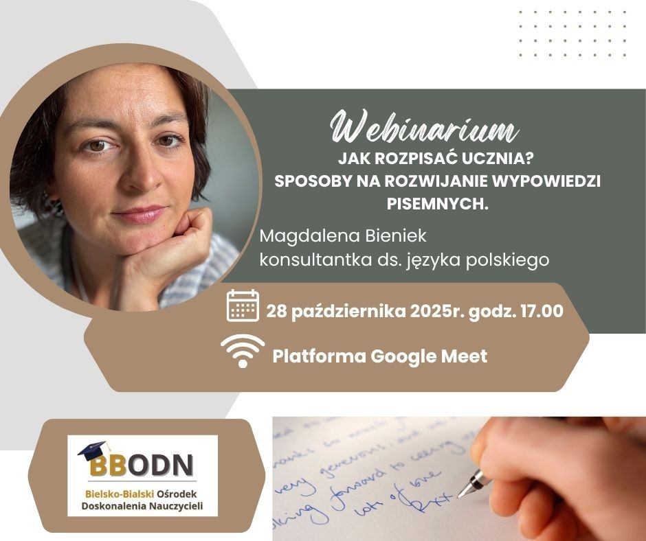 serdecznie zapraszamy nauczycieli języka polskiego na webinarium pt."Jak rozpisać ucznia? Sposoby na rozwijanie wypowiedzi pisemnych", które odbędzie się 28 października 2025r. (wtorek), o godz.17.00, na platformie Google Meet. Szkolenie poprowadzi nasza konsultantka ds.nauczania języka polskiego mgr Magdalena Bieniek.