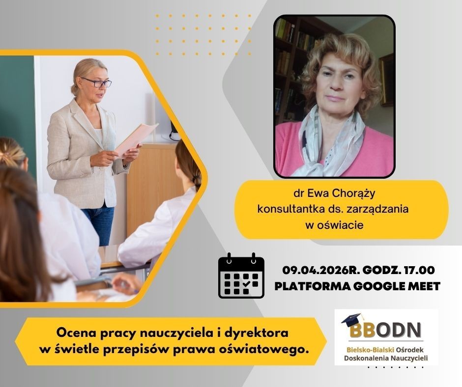 Zapraszamy na szkolenie poświęcone omówieniu aktualnych i nadchodzących zmian w przepisach prawa oświatowego dotyczących oceny pracy nauczycieli oraz dyrektorów. Spotkanie odbędzie się 09.04.2026r. o godz. 17:00 na platformie Google Meet i poprowadzi je dr Ewa Chorąży - konsultantka ds. zarządzania w oświacie.