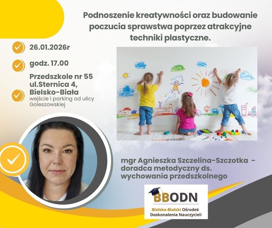 Zapraszamy na szkolenie pt. „Podnoszenie kreatywności oraz budowanie poczucia sprawstwa poprzez atrakcyjne techniki plastyczne”, prowadzone przez mgr Agnieszkę Szczelinę-Szczotkę - doradcę metodycznego.