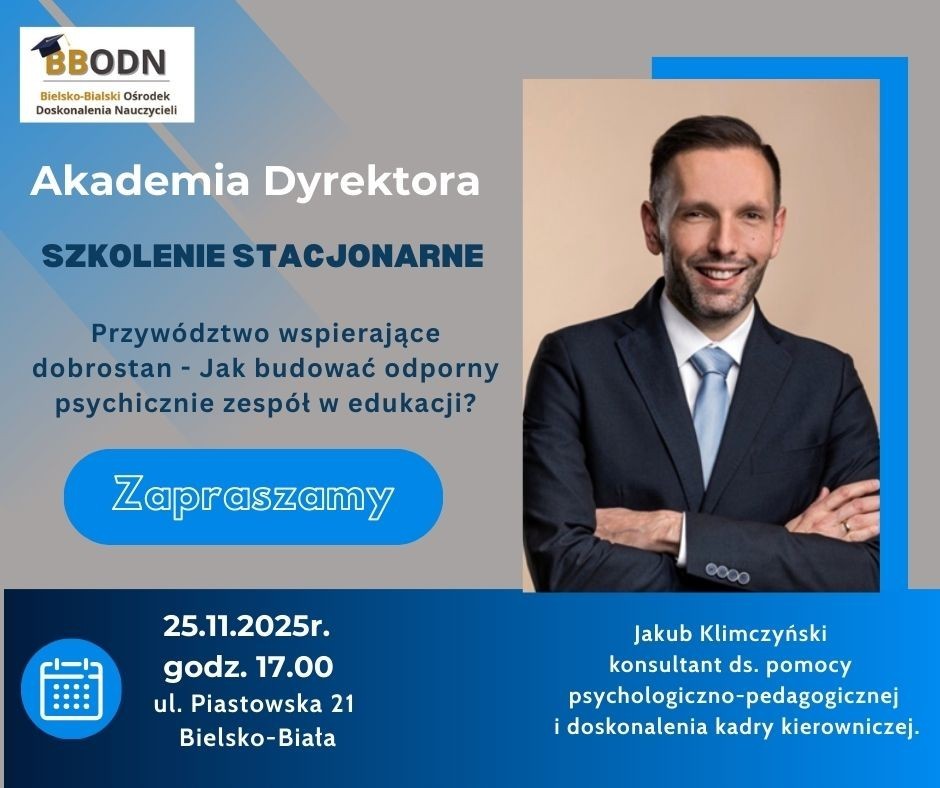 Zapraszamy na inspirujące i praktyczne szkolenie pt. "Przywództwo wspierające dobrostan - Jak budować odporny psychicznie zespół w edukacji?", podczas którego dyrektorzy oraz zainteresowani nauczyciele poznają konkretne narzędzia wspierające dobrostan i odporność psychiczną zespołów nauczycielskich a także własną, które odbędzie się 25.11.2025r. stacjonarnie w naszej siedzibie (budynek BCE) ul. Piastowska 21, Bielsko-Biała. Szkolenie poprowadzi Jakub Klimczyński – konsultant ds. pomocy psychologiczno-pedagogicznej i doskonalenia kadry kierowniczej.