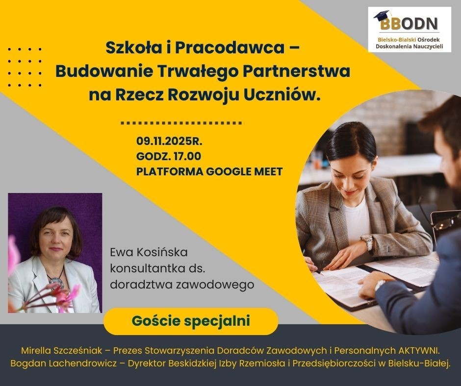 Serdecznie zapraszamy na spotkanie online, którego tematem jest kluczowa dla przyszłości edukacji współpraca szkoły z pracodawcami, silnie akcentowana w tegorocznych kierunkach polityki oświatowej państwa, zwłaszcza w kontekście promocji kształcenia zawodowego.
