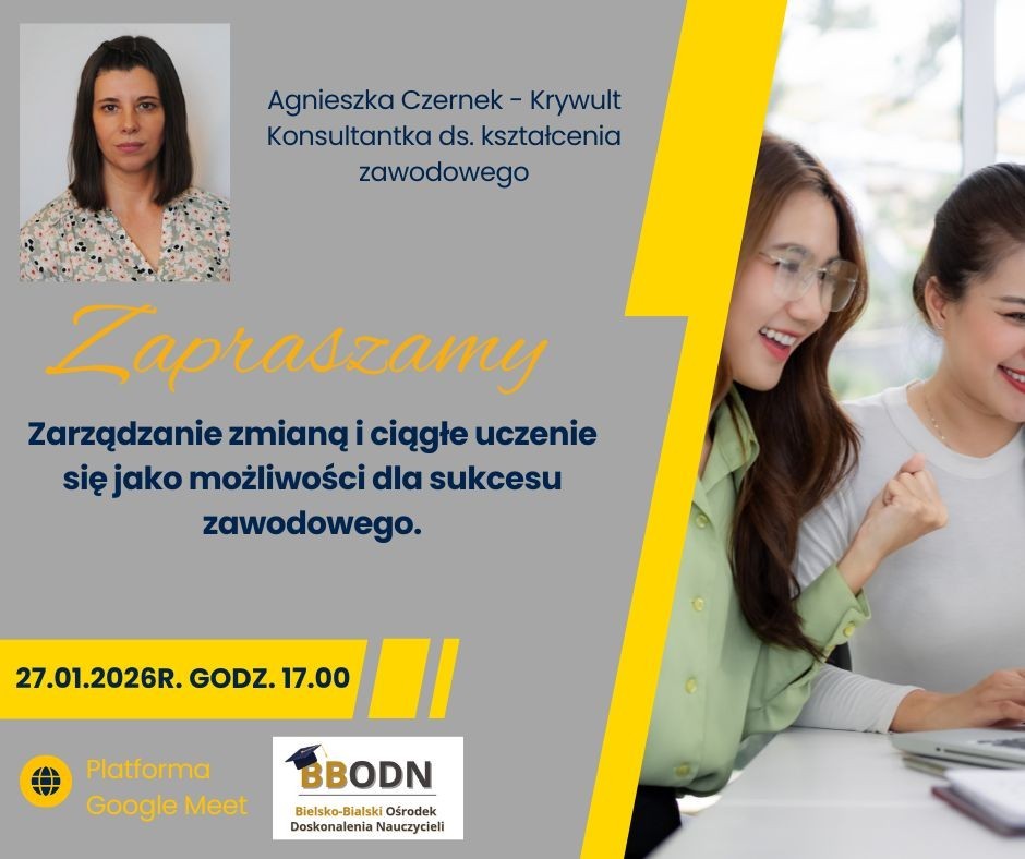 Zapraszamy na szkolenie online „Zarządzanie zmianą i ciągłe uczenie się jako możliwości dla sukcesu zawodowego”, które poprowadzi mgr Agnieszka Czernek‑Krywult – konsultantka ds. kształcenia zawodowego.