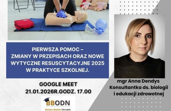 Zapraszamy nauczycieli na szkolenie pt. „Pierwsza pomoc – zmiany w przepisach oraz nowe wytyczne resuscytacyjne 2025 w praktyce szkolnej”. Spotkanie b...
