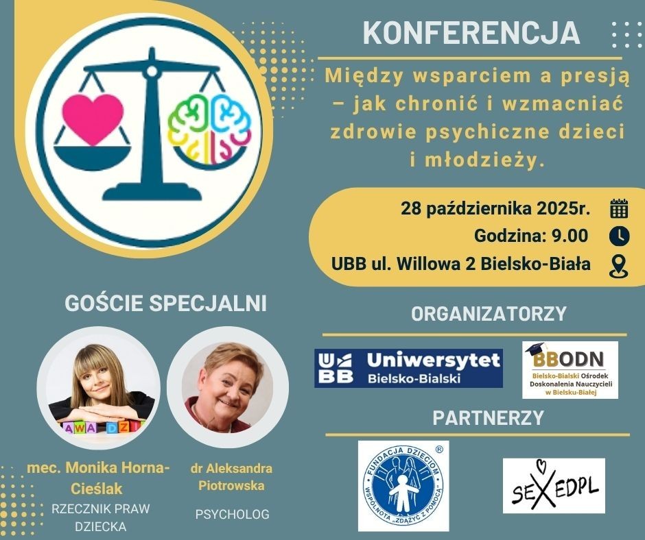 Bielsko-Bialski Ośrodek Doskonalenia Nauczycieli oraz Uniwersytet Bielsko-Bialski mają zaszczyt zaprosić dyrektorów szkół, nauczycieli, pedagogów, psychologów oraz wszystkie osoby zainteresowane tematyką zdrowia psychicznego dzieci i młodzieży do udziału w konferencji pt. „Między wsparciem a presją – jak chronić i wzmacniać zdrowie psychiczne dzieci i młodzieży”.